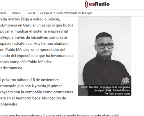 BlogEl pasado 4 de noviembre, nuestro director artístico y fundador Pablo Méndez fue invitado al programa Es Empresa en Galicia de esRadio Galicia, un espacio dedicado a destacar proyectos que inspiran y generan valor desde la comunidad gallega.
