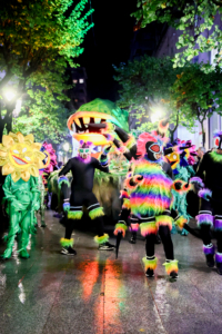 Los trajes multicolor de los “bichos” —hechos a mano con texturas y luces integradas— contrastaban con el ambiente oscuro de la noche, generando un espectáculo hipnótico.