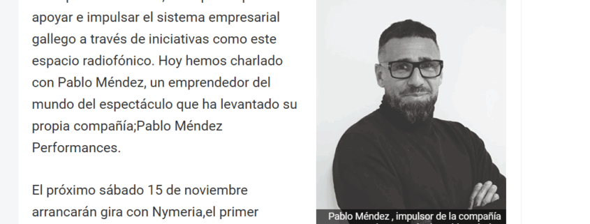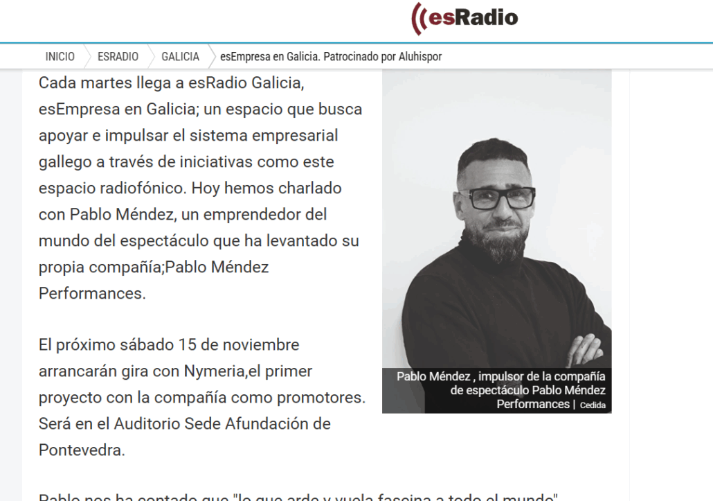 El pasado 4 de noviembre, nuestro director artístico y fundador Pablo Méndez fue invitado al programa Es Empresa en Galicia de esRadio Galicia, un espacio dedicado a destacar proyectos que inspiran y generan valor desde la comunidad gallega.